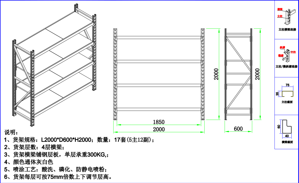 貨架說明:標(biāo)準(zhǔn)貨架 L2000*W600*H2000 5主12副 4層橫梁 載重300KG/層 貨架規(guī)格:內(nèi)長(zhǎng)L2170*W350*H1000 顏色:通體藍(lán)色,標(biāo)準(zhǔn)貨架灰白色 3、噴涂工藝:酸洗、烘干、防靜電噴涂 標(biāo)準(zhǔn)貨架每層可按75mm倍數(shù)/定制架每層可按50mm倍數(shù)上下調(diào)節(jié)層高。