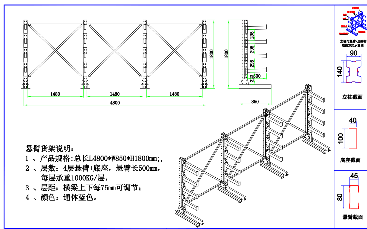 懸臂貨架說明:規(guī)格L4800*W850*H1800 層數(shù) 4層懸臂+底坐,懸臂長(zhǎng)500. 每層承重1000KG/層,層間距:橫梁上下每75mm可調(diào)節(jié) 顏色:通體藍(lán)色